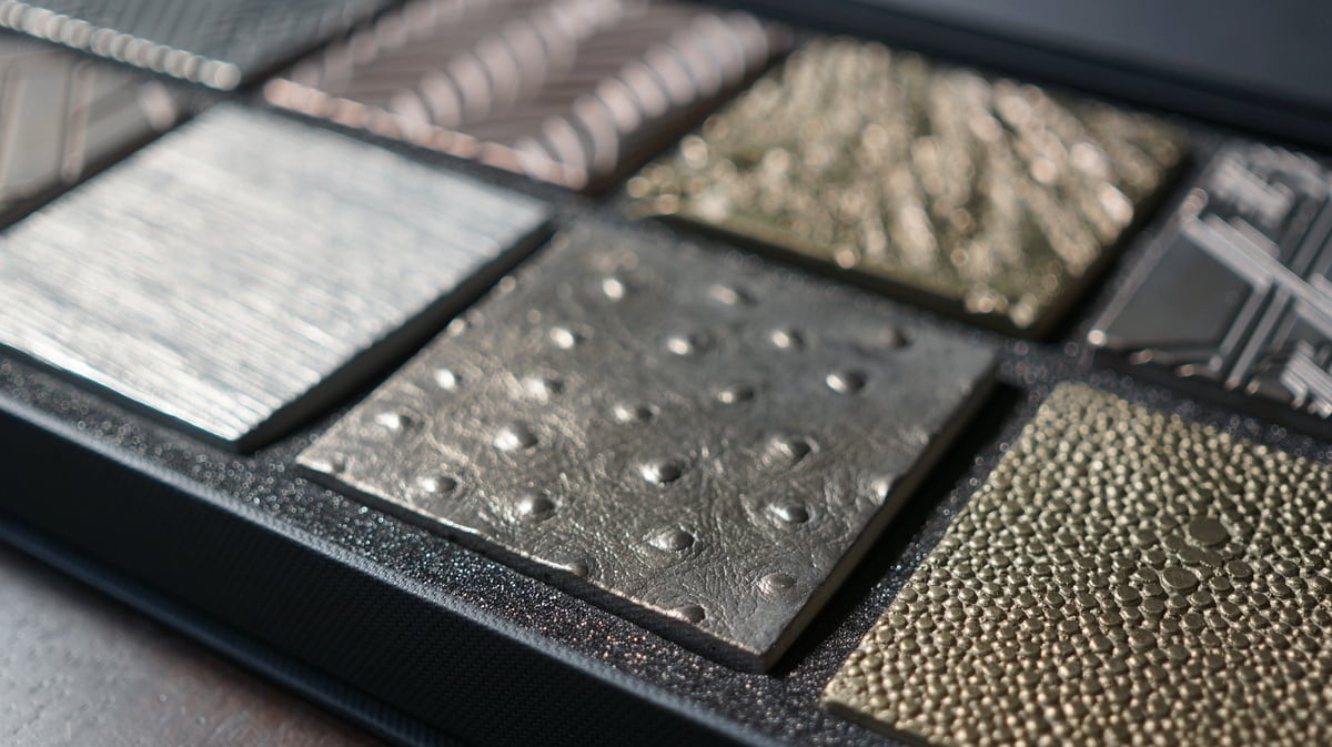 ジェスモナイトのメタルには4種類のフィニッシュがあり、本サンプルボックスには4種類全てが各2づつ入っています。