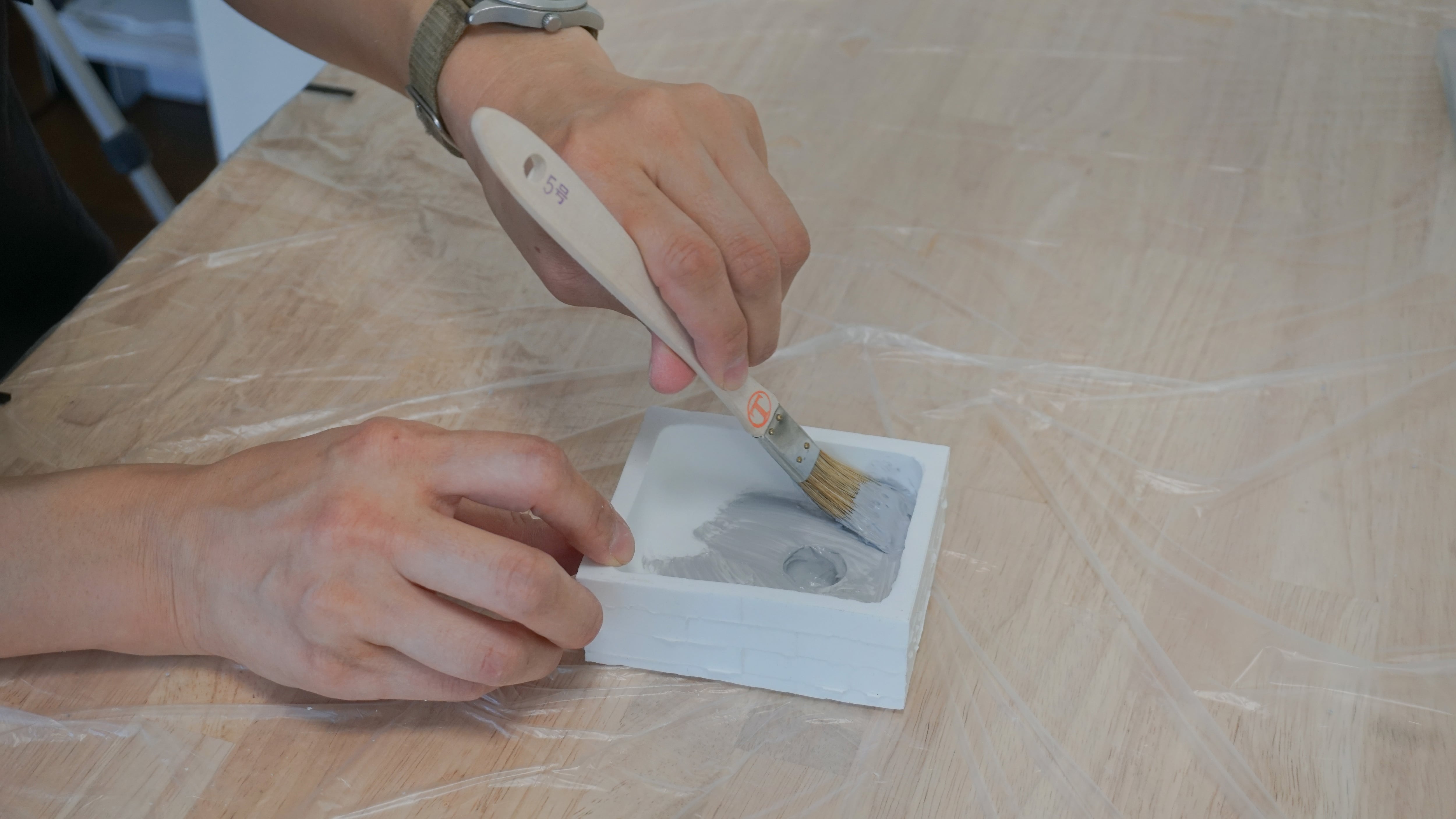 凹凸の多い型で作業する際は、こまかい隙間まで入り込む5号刷毛があると便利です。